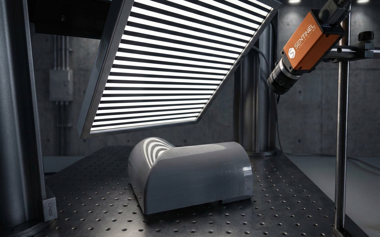 A solução de defletometria é um método óptico para medir deformações, curvaturas e defeitos de superfícies refletivas. Analisa como padrões de luz refletidos pela superfície se distorcem e, a partir dessas distorções, calcula-se a forma e os desvios geométricos com alta precisão.